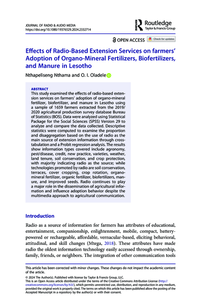 "This study examined the effects of radio-based extension services on farmers’ adoption of organo-mineral fertilizer, biofertilizer, and manure in Lesotho using a sample of 1659 farmers extracted from the 2019/2020 agricultural production survey database Bureau of Statistics (BOS). Data were analyzed using Statistical Package for the Social Sciences (SPSS) Version 29 to analyze and compare the data collected. Descriptive statistics were computed to examine the proportion and disaggregation based on the use of radio as the main source of extension information through crosstabulation and a Probit regression analysis. The results show information types covered include agronomy, pest/disease, credit, new practice, varieties, weather, land tenure, soil conservation, and crop protection, with majority indicating radio as the source; while technologies promoted by radio are soil conservation, terraces, cover cropping, crop rotation, organomineral fertilizer, organic fertilizer, biofertilizers, manure, and improved seeds. Radio continues to play a major role in the dissemination of agricultural information and influence adoption behavior despite the multimedia approach to agricultural communication." (Abstract)