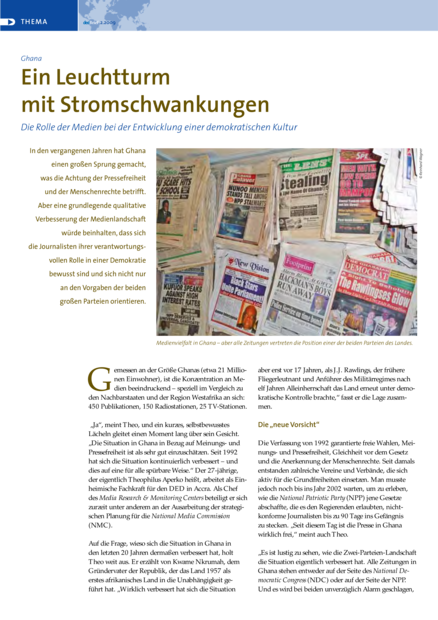 "In den vergangenen Jahren hat Ghana einen großen Sprung gemacht, was die Achtung der Pressefreiheit und der Menschenrechte betrifft. Aber eine grundlegende qualitative Verbesserung der Medienlandschaft würde beinhalten, dass sich die Journalisten ihrer verantwortungsvollen Rolle in einer Demokratie bewusst sind und sich nicht nur an den Vorgaben der beiden großen Parteien orientieren." (Einleitung)