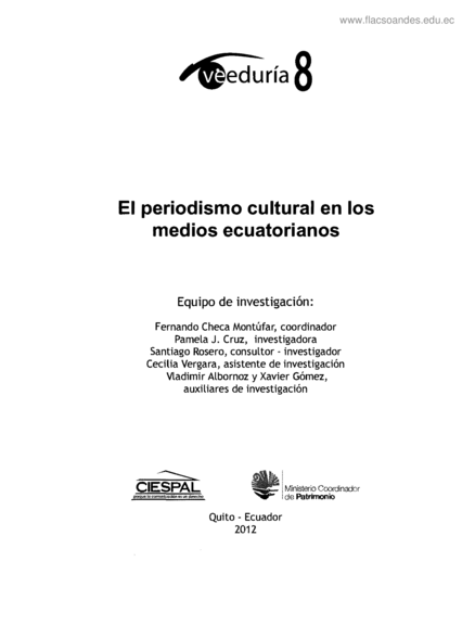 "A diario, los medios de comunicación difunden una parte de la multiplicidad de prácticas, experiencias y expresiones artísticas, urbanas, populares, rurales y masivas de la sociedad. De esa manera, se reafirman como una "institución paradigmática" (Thompson, 1998), con poder para construir una realidad y producir sentidos, a base de las versiones o representaciones que dan sobre los acontecimientos y que se muestran como noticias. Esta investigación, que nace como un aporte entre el CIESPAL y el Ministerio Coordinador de Patrimonio, analiza la construcción de la noticia cultural para, a partir de ella, entender cómo los medios de comunicación del país producen determinadas representaciones sobre cultura. Específicamente, este trabajo centra su exploración en una muestra de periódicos y de telediarios, de Quito y Guayaquil, que está difundiendo información cultural cotidiana." (Descripción de la casa editorial)