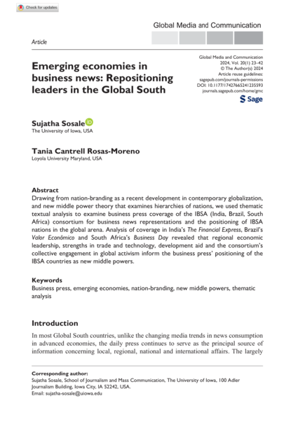 "Drawing from nation-branding as a recent development in contemporary globalization, and new middle power theory that examines hierarchies of nations, we used thematic textual analysis to examine business press coverage of the IBSA (India, Brazil, South Africa) consortium for business news representations and the positioning of IBSA nations in the global arena. Analysis of coverage in India’s The Financial Express, Brazil’s Valor Econômico and South Africa’s Business Day revealed that regional economic leadership, strengths in trade and technology, development aid and the consortium’s collective engagement in global activism inform the business press’ positioning of the IBSA countries as new middle powers." (Abstract)