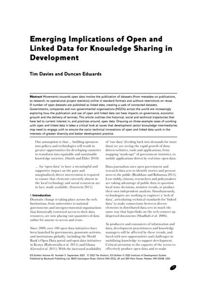 "Movements towards open data involve the publication of datasets (from metadata on publications, to research, to operational project statistics) online in standard formats and without restrictions on reuse. A number of open datasets are published as linked data, creating a web of connected datasets. Governments, companies and non-governmental organisations (NGOs) across the world are increasingly exploring how the publication and use of open and linked data can have impacts on governance, economic growth and the delivery of services. This article outlines the historical, social and technical trajectories that have led to current interest in, and practices around, open data. Drawing on three example cases of working with open and linked data it takes a critical look at issues that development sector knowledge intermediaries may need to engage with to ensure the socio-technical innovations of open and linked data work in the interests of greater diversity and better development practice." (Abstract)