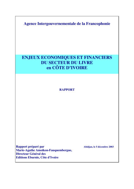 "Rapport commandé en 2003 par l'Agence intergouvernementale de la Francophonie, aujourd'hui intégrée à l'Organisation internationale de la Francophonie. Il examine la situation et les perspectives de la fourniture de livres éducatifs à la lumière de la récente libéralisation de cette partie du secteur du livre par le gouvernement ivoirien ; son intention de fournir progressivement jusqu'à deux millions d'élèves avec des livres gratuits dans le cadre de ses objectifs d'« éducation pour tous », et de développer une stratégie cohérente pour la production et la distribution de ces matériels didactiques. L'auteur examine les principaux acteurs impliqués dans ce plan ambitieux, analysant la faisabilité de la proposition et son mode de financement, son impact probable sur les industries du livre, ainsi que les problèmes et contraintes éventuels liés à sa mise en œuvre." (Hans M. Zell, Publishing, Books & Reading in Sub-Saharan Africa, 3d ed. 2008, nr. 493)