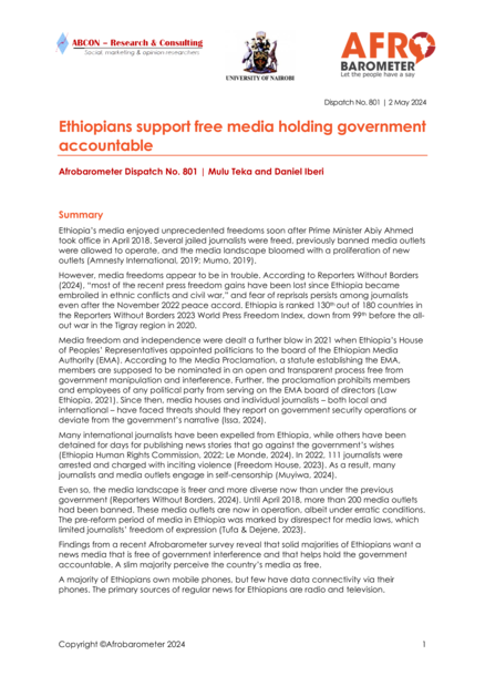 "A large majority (71%) of Ethiopians "agree" or "strongly agree" that the media should "constantly investigate and report on government mistakes and corruption." About six in 10 citizens (59%) endorse the principle that the media "should have the right to publish any views and ideas without government control." A slim majority (51%) of respondents assess their country's media as "somewhat free" or "completely free," while 44% consider the media "not very" or "not at all" free. Close to two-thirds (64%) of adults own a mobile phone, 33% a radio, 29% a television set, and 5% a computer. Only 22% own a mobile phone with Internet connectivity. Radio is Ethiopia's most popular news source: 42% of citizens say they tune in "every day" or "a few times a week." More than a third (35%) say they regularly get news from television, while about two in 10 are regular consumers of news from social media (18%) and the Internet (17%)." Key findings)