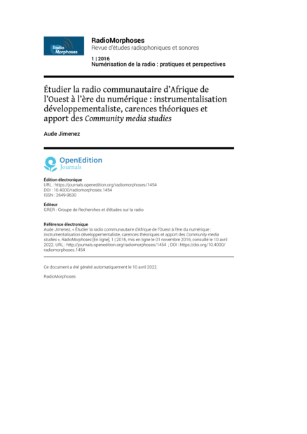 "Les recherches consacrées au lien entre radio et technologies numériques en Afrique se multiplient dans la littérature depuis le début des années 2000. Pourtant, peu d’études portent spécifiquement sur les évolutions technologiques de la radio communautaire du continent. Cette dernière est théoriquement enfermée dans une instrumentalisation développementaliste laissant peu de place à une réelle définition de sa communauté et de ses membres. Les Community media studies nous permettent de déplacer le regard et nous offrent les outils théoriques nécessaires à une conceptualisation intéressante de la radio communautaire en tant que communauté incarnée et créative." (Résumé)