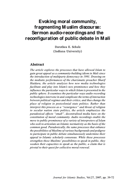 "The article explores the processes that have allowed Islam to gain great appeal as a community-building idiom in Mali since the introduction of multiparty democracy in 1991. Drawing on the mediatic performances of the charismatic preacher Sharif Haidara, the article analyzes how new media technologies facilitate and play into Islam’s new prominence and how they influence the particular ways in which Islam is presented in the public sphere. It examines the particular ways audio recording technologies intervene in and complicate the terms of interaction between political regimes and their critics, and thus change the place of religion in postcolonial state politics. Rather than interpret this process as a “resurgence” and threat of religion to secular nation state politics, the article emphasizes the paradoxical effects “small”, decentralized media have on the constitution of moral community. Audio recordings enable the move to public prominence of a variety of interpreters of Islam who seek to articulate an Islamic normativity as the basis of the common good. Paradoxically, the same processes that enhance the possibilities of Muslims of various backgrounds and pedigree to participate in public debate simultaneously undermine their appeal to Islamic scholarly consensus. While these processes strengthen these Muslims’ possibilities to speak in public, they weaken their capacities to speak as the public, a claim that is pivotal to their quest for collective moral renewal." (Abstract)