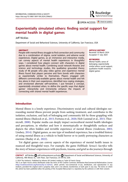 "People with mental illness struggle to find connection and community due to a combination of stigma, social isolation, and adverse social experiences. Digital games, as an immersive and interactive media, can convey aspects of mental health experiences in thoughtful ways. I considered how players connect with characters in digital games about mental health. Combining social network theories and science and technology studies, this qualitative grounded theory study of 48 people who play video games and experience mental illness found that players perceive and form bonds with characters as experientially similar to themselves. Players engaged with different commercially-available games about mental health and felt less alone in their own experiences, identified new coping strategies, and envisioned alternate self-narratives. I put forward a concept, experientially simulated others, to define the specific ways that digital games’ interactivity and immersivity enhance the impacts of connecting with shared mental health experiences." (Abstract)