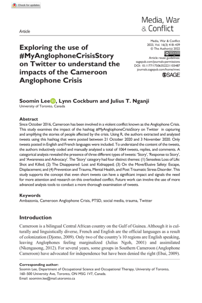 "Since October 2016, Cameroon has been involved in a violent conflict known as the Anglophone Crisis. This study examines the impact of the hashtag #MyAnglophoneCrisisStory on Twitter in capturing and amplifying the stories of people affected by the crisis. Using R, the authors extracted and analyzed tweets using this hashtag that were posted between 21 October 2020 and 3 November 2020. Only tweets posted in English and French languages were included. To understand the content of the tweets, the authors inductively coded and manually analyzed a total of 1064 tweets, replies, and comments. A categorical analysis revealed the presence of three different types of tweets: ‘Story’, ‘Response to Story’, and ‘Awareness and Advocacy’. The ‘Story’ category had four distinct themes: (1) Senseless Loss of Life: Shot and Killed; (2) The Disappeared: Lost and Kidnapped; (3) On the Move/Elusive Safety: Escape, Displacement; and (4) Prevention and Trauma, Mental Health, and Post Traumatic Stress Disorder. This study supports the concept that even short tweets can have a significant impact and signals the need for more attention and research on this overlooked conflict. Future work can involve the use of more advanced analysis tools to conduct a more thorough examination of tweets." (Abstract)