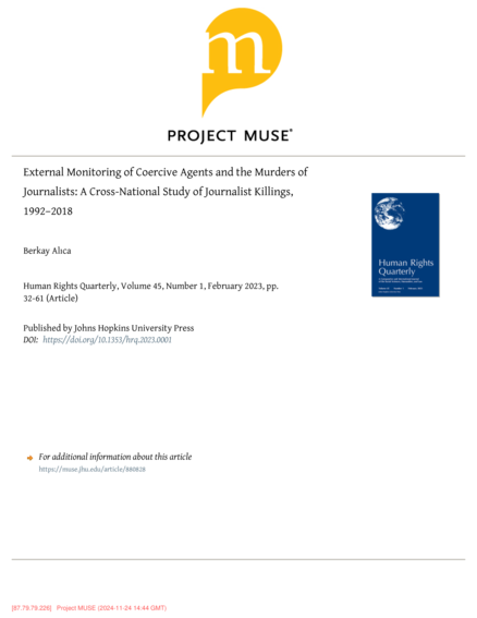 "Targeted attacks on journalists are internationally condemned crimes, which not only undermine freedom of expression, but also symbolize an utter disregard for basic human rights. Yet, murders of journalists occur in all types of regimes, whether autocratic or democratic. This article explores the conditions that enable journalists to be subject to deadly attacks by state officials and unknown perpetrators. The typology of monitoring coercive agents is useful for the distinction between private and public information. External monitors, which share the information they gather with the public and hold the coercive agents accountable, are crucial for a safe working environment for journalists. The results of the multivariate regressions demonstrate that three main indicators of external monitoring, (1) robustness of civil society, (2) independence of media, and (3) strength of the judiciary are all associated with the occurrence of murders of journalists in a country. While a robust civil society and a strong judiciary decreases the probability of journalists being murdered by state officials and unknown perpetrators, a more critical and independent media structure appears to be associated with a higher probability of murders of journalists. The risks of such murders are especially higher for scenarios where the critical media outlets are abundant, but civil society and the judiciary are particularly weak and ineffective." (Abstract)
