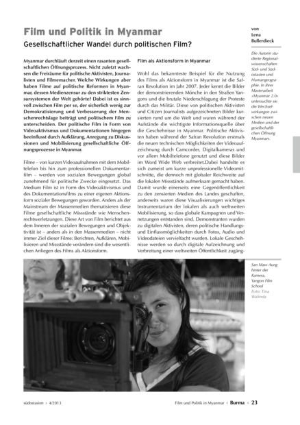 "Myanmar durchläuft derzeit einen rasanten gesellschaftlichen Öffnungsprozess. Nicht zuletzt wachsen die Freiräume für politische Aktivisten, Journalisten und Filmemacher. Welche Wirkungen aber haben Filme auf politische Reformen in Myanmar, dessen Medienzensur zu den striktesten Zensursystemen der Welt gehörte? Dabei ist es sinnvoll zwischen Film per se, der sicherlich wenig zur Demokratisierung und Verbesserung der Menschenrechtslage beiträgt und politischem Film zu unterscheiden. Der politische Film in Form von Videoaktivismus und Dokumentationen hingegen beeinflusst durch Aufklärung, Anregung zu Diskussionen und Mobilisierung gesellschaftliche Öffnungsprozesse in Myanmar." (Abstract)