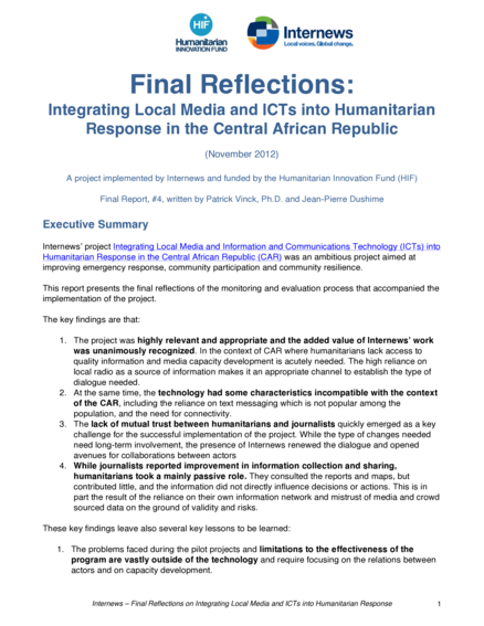 Internews' project Integrating Local Media and Information and Communications Technology (ICTs) into Humanitarian Response in the Central African Republic (CAR) was an project aimed at improving emergency response, community participation and community resilience. This report presents the final reflections of the monitoring and evaluation process that accompanied the implementation of the project.