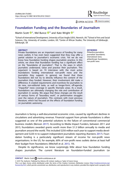 "Private foundations are an important source of funding for many news outlets. It has even been suggested that they may offer a partial solution to journalism’s economic crisis. Yet we do not know how foundation funding shapes journalistic practice. In this article, we show that foundation funding has a significant effect on the “boundaries of journalism”. That is, the ways in which journalists understand, value and practice their journalism. This argument is based on 74 interviews with the most active foundations funding international non-profit news and the journalists they support. In general, we found that these foundations did not try to directly influence the content of the journalism they funded. However, their involvement did make a difference. It created requirements and incentives for journalists to do new, non-editorial tasks, as well as longer-form, off-agenda, “impactful” news coverage in specific thematic areas. As a result, foundations are ultimately changing the role and contribution of journalism in society. We argue that these changes are the result of various forms of “boundary work”, or performative struggles over the nature of journalism. This contrasts with most previous literature, which has focused on the effects of foundation funding on journalistic autonomy." (Abstract)