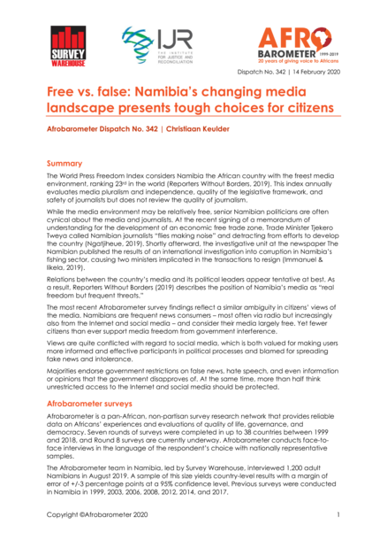 "Most adult Namibians own mobile phones (88%) and radios (67%). Four in 10 (40%) own television sets, and one in four (25%) own computers. Daily Internet use has multiplied over the past decade, increasing from 5% in 2008 to 28% in 2019. But more than four in 10 Namibians (44%) still “never” use the Internet. The most common source of daily news for Namibians is the radio (62%), followed by TV (40%), the Internet (27%), social media (27%), and newspapers (23%). Among the three-fourths (76%) of adult Namibians who have heard of social media, half (51%) see its effects on society as positive, while one-fourth (24%) see them as negative. Social media users are most frequently blamed as sources of false (fake) news (by 67% of respondents), followed by journalists (62%) and politicians (60%). Eight out of 10 Namibians regard the country’s news media as “completely free” (47%) or “somewhat free” (33%). But a majority (56%) think the government should have the right to prevent publications it disapproves of – more than twice as many as a decade ago. Moreover, majorities say the government should be able to limit or prohibit the sharing of false news (64%), of information or opinions that it disapproves of (54%) or that criticize or insult the president (62%), and of hate speech (62%). Yet more than half (55%) of citizens say that unrestricted access to the Internet and social media should be protected." (Key findings)
