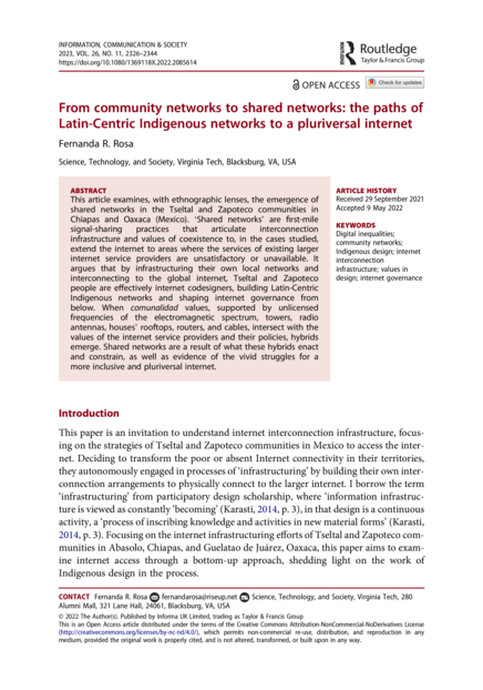 "This article examines, with ethnographic lenses, the emergence of shared networks in the Tseltal and Zapoteco communities in Chiapas and Oaxaca (Mexico). ‘Shared networks’ are first-mile signal-sharing practices that articulate interconnection infrastructure and values of coexistence to, in the cases studied, extend the internet to areas where the services of existing larger internet service providers are unsatisfactory or unavailable. It argues that by infrastructuring their own local networks and interconnecting to the global internet, Tseltal and Zapoteco people are effectively internet codesigners, building Latin-Centric Indigenous networks and shaping internet governance from below. When comunalidad values, supported by unlicensed frequencies of the electromagnetic spectrum, towers, radio antennas, houses’ rooftops, routers, and cables, intersect with the values of the internet service providers and their policies, hybrids emerge. Shared networks are a result of what these hybrids enact and constrain, as well as evidence of the vivid struggles for a more inclusive and pluriversal internet." (Abstract)