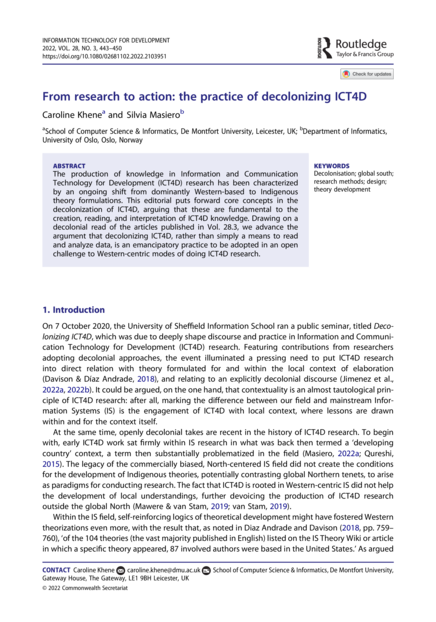 "The production of knowledge in Information and Communication Technology for Development (ICT4D) research has been characterized by an ongoing shift from dominantly Western-based to Indigenous theory formulations. This editorial puts forward core concepts in the decolonization of ICT4D, arguing that these are fundamental to the creation, reading, and interpretation of ICT4D know ledge. Drawing on a decolonial read of the articles published in Vol. 28.3, we advance the argument that decolonizing ICT4D, rather than simply a means to read and analyze data, is an emancipatory practice to be adopted in an open challenge to Western-centric modes of doing ICT4D research." (Abstract)