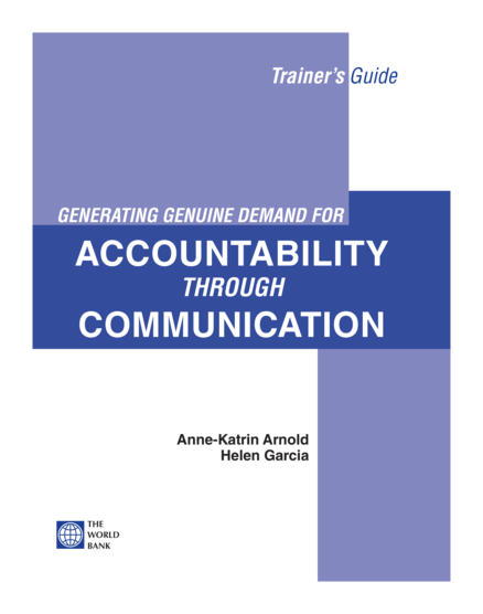 "This guide is designed for development practitioners in donor organizations, governments, and civil society, who are setting up capacity-building programs for promoting sustainable accountability and governance reform. A conceptual framework for communication and accountability provides trainers with an understanding of the role of communication, while several case studies exemplify communication for accountability in developing countries. The guide proposes a training structure and provides training materials as well as exercises." (Back cover)
