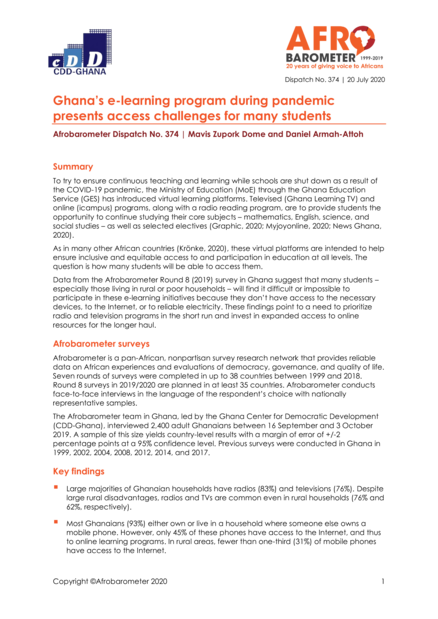 "Afrobarometer findings show that radio and television are the most widely accessible platforms for students seeking to participate in MoE/GES e-learning programs, although rural and poor households are at a disadvantage when it comes to owning these devices. The data show relatively low rates of access to the Internet via mobile phone, ownership of computers, and regular use of the Internet, particularly among respondents in rural and poor households, highlighting the difficulties that many students will face in engaging with online learning programs. While most households are connected to the electric grid, more than four in 10 rural and poor households do not have a power supply that works most or all of the time. For both government and civil society, these findings indicate potential learning gaps, as not all students will be able to access e-learning programs from all platforms. This points to the need for strategies to increase students’ participation, particularly targeting rural and poor families, by raising awareness of available televised programs and launching radio-based remote-learning programs as soon as possible. To ensure inclusion and participation in online platforms such as icampus, the government and schools should initiate longer-term plans and investments capable of spreading e-learning infrastructure, irrespective of settlement types and poverty levels, to facilitate access for all students." (Conclusion)