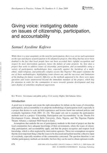"While there is a near unanimity on the need for participation, there is as yet no such agreement on the type and degree of participation to be adopted in projects. One thing that has never been doubted is the fact that local people have not been accorded their rightful recognition and respect by most intervention agencies, hence the failure of some projects. So, how does a project that seeks to address issues of citizenship, participation, and accountability using a variety of participatory methodologies fare, especially against the backdrop of a multiethnic, multi-religious, and politically complex society like Nigeria? This paper examines the use of these methodologies, highlighting issues drawn out, and the successes and limitations of the findings for future research. Effective as the methods appeared to be, there were many questions and issues unanswered beyond the immediate mandate of the project, which beg for attention in order for the communities to move towards genuine development and stop open display of sometimes misplaced aggression." (Abstract)