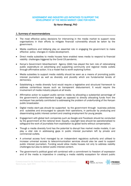 "This paper explores the instances and circumstances under which the media community in Kenya has closely worked with the government to introduce media reforms though new legislation and related policies. It focuses on changes that have been enacted over the last decade and, in particular, those aimed at responding to challenges related to media viability. The study also explores media-exclusive initiatives that have indirectly influenced policy on the media market." (Introduction, page 2)
