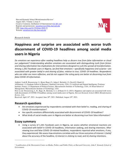 "Do emotions we experience after reading headlines help us discern true from false information or cloud our judgement? Understanding whether emotions are associated with distinguishing truth from fiction and sharing information has implications for interventions designed to curb the spread of misinformation. Among 1,341 Facebook users in Nigeria, we find that emotions—specifically happiness and surprise—are associated with greater belief in and sharing of false, relative to true, COVID-19 headlines. Respondents who are older are more reflective, and do not support the ruling party are better at discerning true from false COVID-19 information."