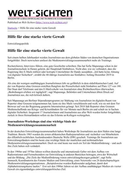 "Seit einem halben Jahrhundert werden Journalisten aus dem globalen Süden von deutschen Organisationen fortgebildet. Doch inzwischen umfasst die Medienentwicklungszusammenarbeit mehr als Trainings." (Seite 22)