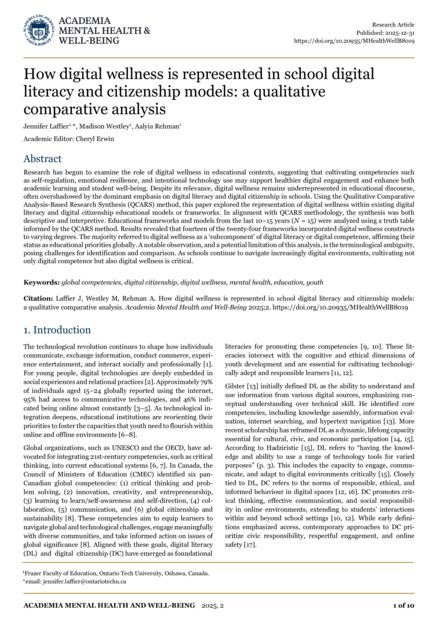 "Research has begun to examine the role of digital wellness in educational contexts, suggesting that cultivating competencies such as self-regulation, emotional resilience, and intentional technology use may support healthier digital engagement and enhance both academic learning and student well-being. Despite its relevance, digital wellness remains underrepresented in educational discourse, often overshadowed by the dominant emphasis on digital literacy and digital citizenship in schools. Using the Qualitative Comparative Analysis-Based Research Synthesis (QCARS) method, this paper explored the representation of digital wellness within existing digital literacy and digital citizenship educational models or frameworks. In alignment with QCARS methodology, the synthesis was both descriptive and interpretive. Educational frameworks and models from the last 10–15 years (N = 15) were analyzed using a truth table informed by the QCARS method. Results revealed that fourteen of the twenty-four frameworks incorporated digital wellness constructs to varying degrees. The majority referred to digital wellness as a ‘subcomponent’ of digital literacy or digital competence, affirming their status as educational priorities globally. A notable observation, and a potential limitation of this analysis, is the terminological ambiguity, posing challenges for identification and comparison. As schools continue to navigate increasingly digital environments, cultivating not only digital competence but also digital wellness is critical." (Abstract)