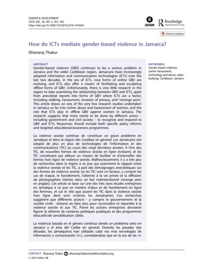"Gender-based violence (GBV) continues to be a serious problem in Jamaica and the wider Caribbean region. Jamaicans have increasingly adopted information and communication technologies (ICTs) over the last two decades. In the era of ICTs, new forms of online GBV are evolving, and ICTs also offer a means of facilitating and escalating offline forms of GBV. Unfortunately, there is very little research in the region to date examining the relationship between GBV and ICTs, apart from anecdotal reports into forms of GBV where ICTs are a factor including stalking, harassment, invasion of privacy, and revenge porn’. This article draws on one of the very few research studies undertaken in Jamaica so far into online abuse and harassment of women, and the role that ICTs play in offline GBV against women in Jamaica. The research suggests that more needs to be done by different actors – including government and civil society – to recognise and respond to GBV and ICTs. esponses should include both specific policy reforms and targeted educational/awareness programmes." (Abstract)