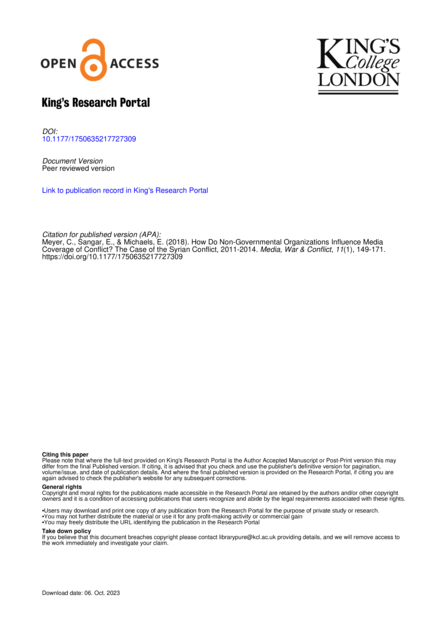 "It is often argued that non-governmental organizations (NGOs) have become increasingly visible in media discourses on armed conflict and thus play a growing role in shaping states’ foreign policies. However, there is little investigation of their influence on specific conflict coverage and what types of NGOs are influential, in what way and under what conditions. The authors elaborate a ‘supply and demand’ model of growing or declining NGO influence to theorize these dynamics and take Syria’s civil war from 2011–2014 as a ‘best case’ for testing it. They conducted an interpretative analysis of NGO output and media coverage to investigate the relative visibility of NGOs in the media over time. Further, they examine how different NGOs were referred to during two highly salient phases of the conflict for debates about foreign policy: the first escalation of protests and their repression in 2011 and the use of chemical weapons in 2013. They find evidence of rising NGO visibility and growing reliance on new types of semi-local NGOs for the provision of factual news about the conflict and human rights violations. Yet, large international NGOs such as Amnesty International and Human Rights Watch remained the most influential in pushing normative frames and advocating a tough stance on the Assad regime. The article discusses the implications of the findings for the theoretical argument and for broader accounts of NGOs influence." (Abstract)