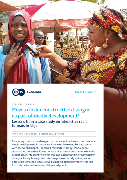 "This case study shows that media development endeavors to foster constructive dialogue require concerted effort. They have to be in closely interwoven with local realities and needs — be it at the country, community or individual level. The example of interactive radio formats in Niger illustrates that journalistic formats bringing together conflict-affected groups require thorough preparation, an understanding of the challenges posed by safety threats, trauma or gender inequality (and their intersections), and the ability to act upon these challenges sensitively and flexibly. Yet, these efforts are worthwhile, because they do make a difference: In our case study, people from various social groups perceived the value in making contact, engaging in exchange, being listened to, learning about each other’s concerns, developing common approaches to problem-solving and implementing them in their communities. In doing so, they enlarged the space for self-reliance in often tense and unpredictable situations, which seemingly continued even after the project as such (and our data collection) was completed. In Téra, for example, members of the “dialogue and concertation committee” founded a club that takes engages in IDP and refugee issues. Of course, there are many different ways to foster constructive dialogue. While this study focused on a single project with a specific design, its take-aways are able to inform dialogical media development projects more broadly — especially those strengthening media outlets in hostile environments and promoting the voices [of] marginalized groups." (Page 16)