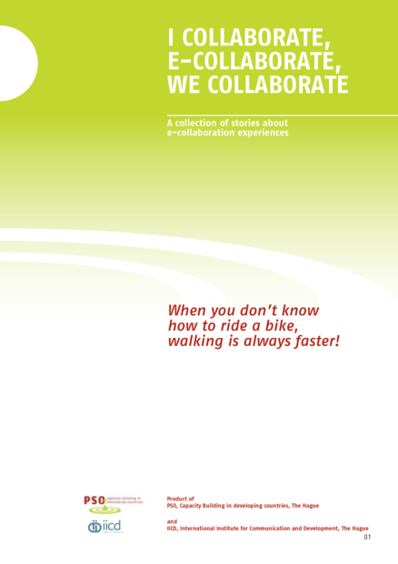"This booklet describes 14 stories of organisations using e-collaboration in some way, varying from using Moodle as an online learning platform to Teamspeak as a software tool for having an online meeting with partners located all over the globe. We hope to inspire you with these experiences, stimulating you to take this first step, using your work as a laboratory for experimenting." (Foreword)