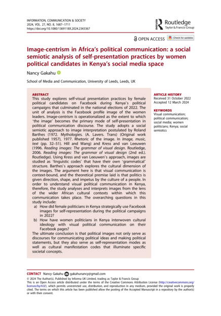 "This study explores self-visual presentation practices by female political candidates on Facebook during Kenya’s political campaigns that culminated in the national elections of 2022. The unit of analysis is the Facebook profile image of the women leaders. Image-centrism is operationalized as the extent to which ‘the image’ becomes the primary mode of self-presentation in political communication discourse. The study adopts a social semiotic approach to image interpretation postulated by Roland Barthes (1972) and Kress and van Leeuwen (1996). Using Kress and van Leeuwen’s approach, images are studied as ‘linguistic codes’ that have their own ‘grammatical’structure. Barthes’s approach explores the cultural dimension of the images. The argument here is that visual communication is context-bound, and the theoretical premise laid is that politics is given direction, shape, and impetus by the culture of a people. In order to understand visual political communication in Kenya, therefore, the study analyses and interprets images from the lens of the wider African cultural contexts within which this communication takes place. The overarching questions in this study include: a) How did female politicians in Kenya strategically use Facebook images for self-representation during the political campaigns in 2022? b) How have women politicians in Kenya interwoven cultural ideology with visual political communication on their Facebook pages? The ultimate conclusion is that political images not only serve as discourses for communicating political ideas and making political statements, but they also serve as self-representation modes as well as cultural manifestation codes that illuminate specific societal concepts." (Abstract)