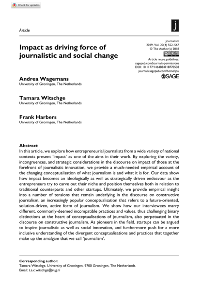 "In this article, we explore how entrepreneurial journalists from a wide variety of national contexts present ‘impact’ as one of the aims in their work. By exploring the variety, incongruences, and strategic considerations in the discourse on impact of those at the forefront of journalistic innovation, we provide a much-needed empirical account of the changing conceptualisation of what journalism is and what it is for. Our data show how impact becomes an ideologically as well as strategically driven endeavour as the entrepreneurs try to carve out their niche and position themselves both in relation to traditional counterparts and other startups. Ultimately, we provide empirical insight into a number of tensions that remain underlying in the discourse on constructive journalism, an increasingly popular conceptualisation that refers to a future-oriented, solution-driven, active form of journalism. We show how our interviewees marry different, commonly-deemed incompatible practices and values, thus challenging binary distinctions at the heart of conceptualisations of journalism, also perpetuated in the discourse on constructive journalism. As pioneers in the field, startups can be argued to inspire journalistic as well as social innovation, and furthermore push for a more inclusive understanding of the divergent conceptualisations and practices that together make up the amalgam that we call ‘journalism’." (Abstract)