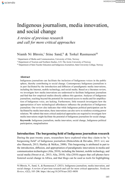 "Indigenous journalism can facilitate the inclusion of Indigenous voices in the public sphere, thereby contributing to social change. Contemporary Indigenous journalism is in part facilitated by the introduction and diffusion of paradigmatic media innovations, including the Internet, mobile technology, and social media. Based on a literature review, we investigate how media innovations are understood to facilitate Indigenous journalism and find that few empirical studies directly address this question. Analyses of Indigenous journalism, reaching beyond the potential for increased access to media and for amplification of Indigenous voice, are lacking. Furthermore, little research investigates how the appropriation of new technological affordances influence the production of Indigenous journalism. Our review also indicates that while Indigenous political participation can be facilitated by media innovation, these innovations can also serve to reinforce existing power relations. We submit that more critical analytical approaches are required to investigate how media innovations might facilitate the potential of Indigenous journalism for social change." (Abstract)