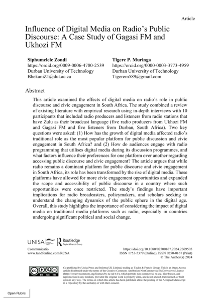 "This article examined the effects of digital media on radio’s role in public discourse and civic engagement in South Africa. The study combined a review of existing literature with empirical research using in-depth interviews with 10 participants that included radio producers and listeners from radio stations that have Zulu as their broadcast language (five radio producers from Ukhozi FM and Gagasi FM and five listeners from Durban, South Africa). Two key questions were asked: (1) How has the growth of digital media affected radio’s traditional role as the most popular platform for public discussion and civic engagement in South Africa? and (2) How do audiences engage with radio programming that utilises digital media during its discussion programmes, and what factors influence their preferences for one platform over another regarding accessing public discourse and civic engagement? The article argues that while radio remains a dominant platform for public discourse and civic engagement in South Africa, its role has been transformed by the rise of digital media. These platforms have allowed for more civic engagement opportunities and expanded the scope and accessibility of public discourse in a country where such opportunities were once restricted. The study’s findings have important implications for radio broadcasters, policymakers, and scholars seeking to understand the changing dynamics of the public sphere in the digital age. Overall, this study highlights the importance of considering the impact of digital media on traditional media platforms such as radio, especially in countries undergoing significant political and social change." (Abstract)