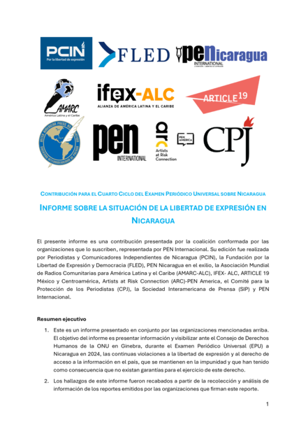 "Este es un informe presentado en conjunto por las organizaciones mencionadas arriba. El objetivo del informe es presentar información y visibilizar ante el Consejo de Derechos Humanos de la ONU en Ginebra, durante el Examen Periódico Universal (EPU) a Nicaragua en 2024, las continuas violaciones a la libertad de expresión y al derecho de acceso a la información en el país, que se mantienen en la impunidad y que han tenido como consecuencia que no existan garantías para el ejercicio de este derecho." (Página 1)