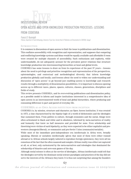 "This paper examines the publishing activities of the Council for the Development of Social Science Research in Africa (CODESRIA) and its ever-evolving publications and dissemination policies. The author offers this “as a possible model to inform and inspire institutions interested in a comprehensive idea of open access in an interconnected world of local and global hierarchies, where producing and consuming difference is part and parcel of everyday life." (Hans M. Zell, Publishing, Books & Reading in Sub-Saharan Africa, 3d ed. 2008, nr. 2580)