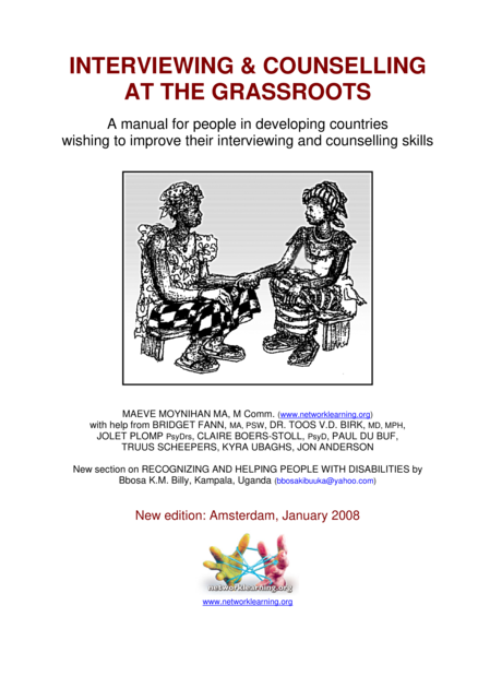 "This manual is, firstly, about Interviewing (Section Two). This is the art and skill of getting the information you need from someone. Information may be facts – perhaps those needed to register a new client - or you might want to go further, looking perhaps for an understanding of the new contact’s emotional situation. The second half of the manual is about Counselling (Section Three), which is the art and skill of helping someone to make their own good choices. Guidance is a word for a similar process, when people offer informal ideas and solutions to others, as advice concerning the life challenges they are facing. But this manual uses the word counselling. It suggests finding solutions together, rather than one person offering solutions and the other person accepting them." (Page 3)