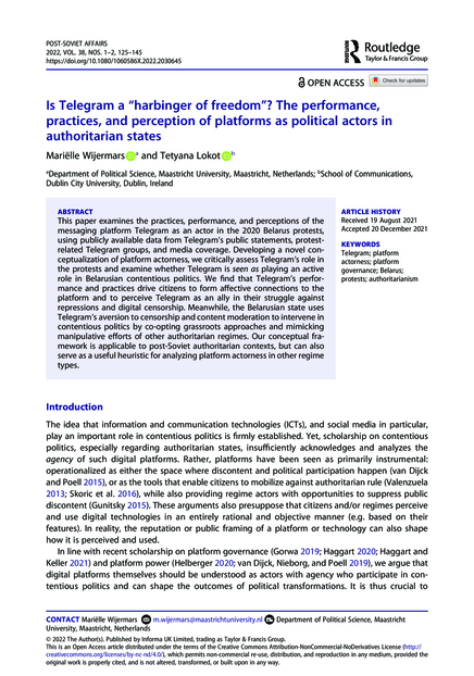 "This paper examines the practices, performance, and perceptions of the messaging platform Telegram as an actor in the 2020 Belarus protests, using publicly available data from Telegram’s public statements, protest-related Telegram groups, and media coverage. Developing a novel conceptualization of platform actorness, we critically assess Telegram’s role in the protests and examine whether Telegram is seen as playing an active role in Belarusian contentious politics. We find that Telegram’s performance and practices drive citizens to form affective connections to the platform and to perceive Telegram as an ally in their struggle against repressions and digital censorship. Meanwhile, the Belarusian state uses Telegram’s aversion to censorship and content moderation to intervene in contentious politics by co-opting grassroots approaches and mimicking manipulative efforts of other authoritarian regimes. Our conceptual framework is applicable to post-Soviet authoritarian contexts, but can also serve as a useful heuristic for analyzing platform actorness in other regime types." (Abstract)