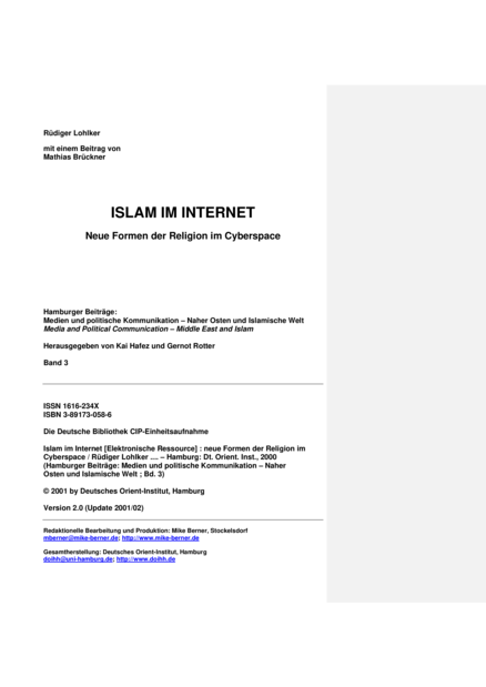"Religion im Internet ist ein bisher kaum untersuchtes Phänomen. Dies gilt ohne Zweifel auch für den Bereich des Islams im Internet. In Einzelstudien und einem umfangreichen Katalog wird versucht, erste Ansätze zu formulieren, Theorien zum Verständnis dieses Phänomens zu entwickeln. Themen sind der Koran im Internet, Fatwas und die Minderheit der Submitters. Ziel ist es, über die Schlagworte vom "digital jihad" u.ä. hinauszugehen und den Islam im Internet als Teil des zeitgenössischen Islams zu begreifen. Wandlungen, die sich aus den benutzten Medien ergeben, sind dabei von besonderem Interesse." (Verlagsbeschreibung)