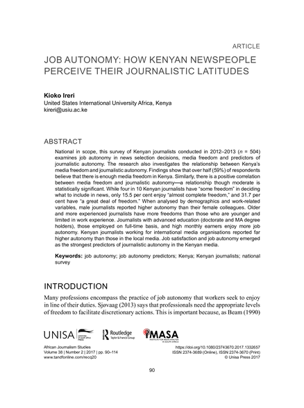 "National in scope, this survey of Kenyan journalists conducted in 2012–2013 (n = 504) examines job autonomy in news selection decisions, media freedom and predictors of journalistic autonomy. The research also investigates the relationship between Kenya’s media freedom and journalistic autonomy. Findings show that over half (59%) of respondents believe that there is enough media freedom in Kenya. Similarly, there is a positive correlation between media freedom and journalistic autonomy—a relationship though moderate is statistically significant. While four in 10 Kenyan journalists have “some freedom” in deciding what to include in news, only 15.5 per cent enjoy “almost complete freedom,” and 31.7 per cent have “a great deal of freedom.” When analysed by demographics and work-related variables, male journalists reported higher autonomy than their female colleagues. Older and more experienced journalists have more freedoms than those who are younger and limited in work experience. Journalists with advanced education (doctorate and MA degree holders), those employed on full-time basis, and high monthly earners enjoy more job autonomy. Kenyan journalists working for international media organisations reported far higher autonomy than those in the local media. Job satisfaction and job autonomy emerged as the strongest predictors of journalistic autonomy in the Kenyan media." (Abstract)