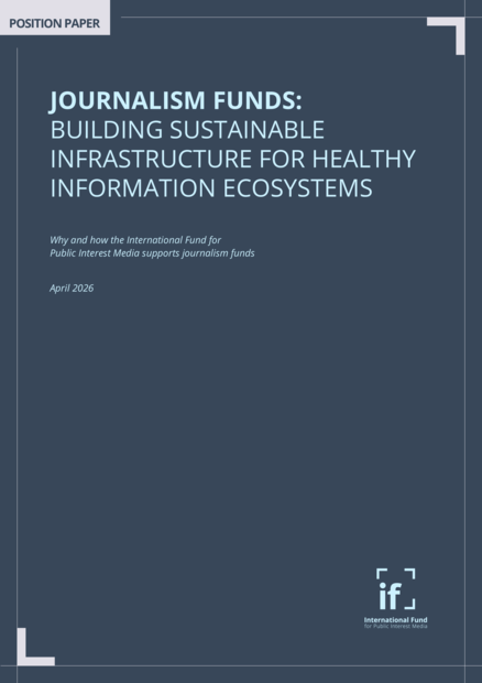 "This position paper presents the International Fund for Public Interest Media’s vision for journalism funds as a promising structural and sustainable solution for financing independent journalism at scale. It draws on our experience as a multilateral pooled fund, as well as our work funding, advising, and convening a new generation of journalism funds across the Global South. Aimed at media and media support practitioners, current and prospective funders, and the broader community of professionals concerned with the future of independent journalism, the paper examines how national and regional journalism funds can anchor a new model for resourcing reliable information as a public good. It also explains how the International Fund supports the development of journalism funds and offers insights on building credible, locally rooted, and independently governed funds capable of mobilizing resources at the scale that the sector needs. By supporting individual initiatives, helping to shape a global movement of journalism funds, and encouraging collective action, we aim to grow this model into an essential and enduring part of the democratic infrastructure for healthy information ecosystems." (Introduction)