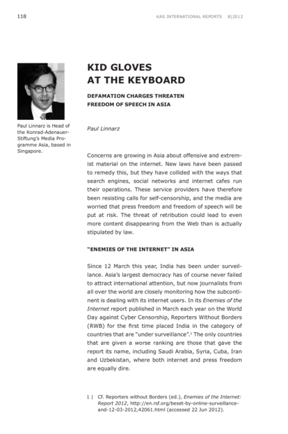 "Concerns are growing in Asia about offensive and extremist material on the internet. New laws have been passed to remedy this, but they have collided with the ways that search engines, social networks and internet cafes run their operations. These service providers have therefore been resisting calls for self-censorship, which is often technically difficult, too. And the media are worried that press freedom and freedom of speech will be put at risk. The threat of retribution could lead to even more content disappearing from the Web than is actually stipulated by law." (Introduction)