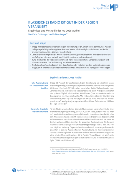 "Knapp 93 Prozent der deutschsprachigen Bevölkerung ab 14 Jahren hören der ma 2025 Audio I zufolge regelmäßig Audioangebote. Fast drei Viertel schalten täglich mindestens ein Radioprogramm ein und dies über vier Stunden lang. Der Radiomarkt fragmentiert weiter – die Anzahl der genannten Sender, an die sich die für die ma Befragten erinnern, hat sich von 1996 bis heute mehr als verdoppelt. Rund drei Fünftel der Radiohörerinnen und -hörer weisen eine hohe Senderbindung auf und schalten an einem Durchschnittstag nur einen Sender ein. Am Beispiel des Saarlands zeigt sich, dass Radiosender mit einer starken regionalen Verwurzelung auch in einem sich verändernden Marktumfeld weiterhin in der Hörergunst vorne liegen." (Kurz und knapp, Seite 1)