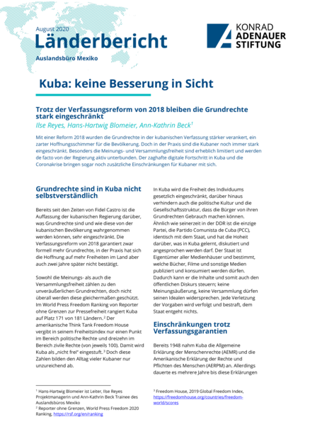 "Mit einer Reform 2018 wurden die Grundrechte in der kubanischen Verfassung stärker verankert, ein zarter Hoffnungsschimmer für die Bevölkerung. Doch in der Praxis sind die Kubaner noch immer stark eingeschränkt. Besonders die Meinungs- und Versammlungsfreiheit sind erheblich limitiert und werden de facto von der Regierung aktiv unterbunden. Der zaghafte digitale Fortschritt in Kuba und die Coronakrise bringen sogar noch zusätzliche Einschränkungen für Kubaner mit sich." (Seite 1)