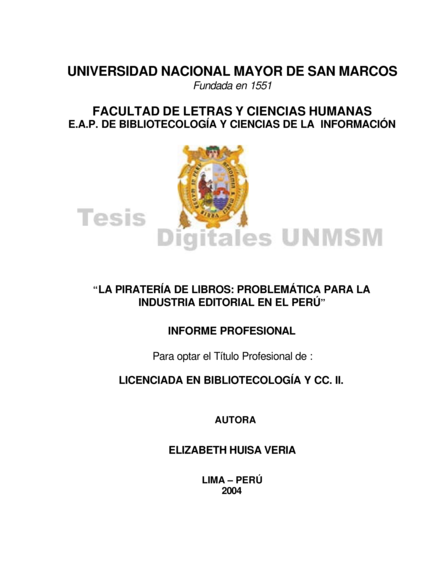 Lima: Universidad Nacional Mayor de San Marcos, Facultad de Letras y Ciencias Humanas, EAP de Bibliotecología y Ciencias de la Información, Informe Profesional (2004), ix, 145 pp.