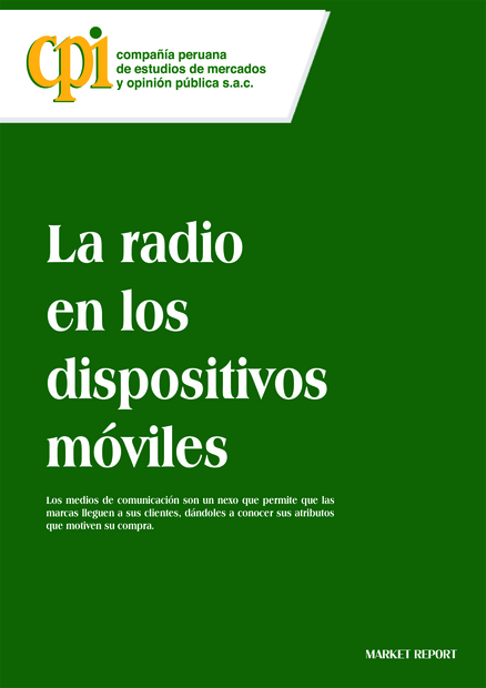 "Son los jóvenes de 11 a 25 años los que consumen más radio en sus celulares (52% a nivel nacional y 60% en Lima); quedando demostrado que el celular no solo es un medio de comunicación entre personas, sino que además es un medio de distracción en la rutina diaria. En el segmento de 26 a 50 años, si bien es cierto es importante el consumo de radio en celulares, dista mucho del grupo de 11 a 25 años (39% a nivel nacional y 48% en Lima). A partir de los 51 años el alcance decae a menos del 20% a nivel nacional, ya que les cuesta trabajo adaptarse a estos dispositivos y se sienten más cómodos con los aparatos convencionales de radio. La cantidad de emisoras radiales que operan en el país y su variada programación hacen de este medio una alternativa muy segmentada para los anunciantes, donde encontramos formatos especializados por géneros musicales e informativos: el género de emisoras Mix donde predomina la música actual como el reggaetón, la salsa y el latin pop, es el más sintonizado en Lima por jóvenes de 11 a 25 años alcanzando el 63% durante la semana." (Página 2)