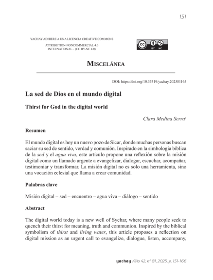 "El mundo digital es hoy un nuevo pozo de Sicar, donde muchas personas buscan saciar su sed de sentido, verdad y comunión. Inspirado en la simbología bíblica de la sed y el agua viva, este artículo propone una reflexión sobre la misión digital como un llamado urgente a evangelizar, dialogar, escuchar, acompañar, testimoniar y transformar. La misión digital no es solo una herramienta, sino una vocación eclesial que llama a crear comunidad." (Abstract)