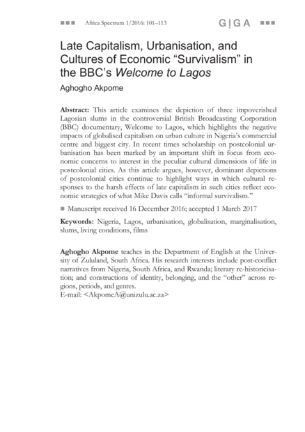 "This article examines the depiction of three impoverished Lagosian slums in the controversial British Broadcasting Corporation (BBC) documentary, Welcome to Lagos, which highlights the negative impacts of globalised capitalism on urban culture in Nigeria’s commercial centre and biggest city. In recent times scholarship on postcolonial urbanisation has been marked by an important shift in focus from economic concerns to interest in the peculiar cultural dimensions of life in postcolonial cities. As this article argues, however, dominant depictions of postcolonial cities continue to highlight ways in which cultural responses to the harsh effects of late capitalism in such cities reflect economic strategies of what Mike Davis calls “informal survivalism." (Abstract)