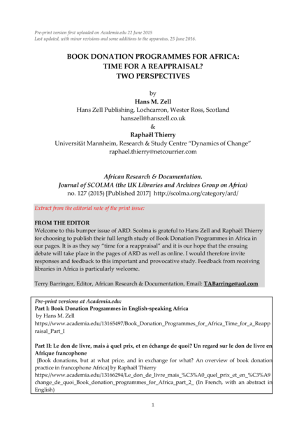 "Un des arguments prioritaires du don de livre en Afrique, c’est qu’il n’y a pas (ou pas assez) de livres. C’est en fait, peut-être, l’inverse: il y a un monopole du livre étranger qui ne permettrait pas au livre africain de rayonner suffisamment pour être connu/reconnu dans le monde. Le don serait donc la ‘fin de chaine’ d’un processus de minorisation: il contribuerait à la sous-représentation documentaire, voire à la dévalorisation des productions africaines, véhiculant l’image d’un continent de friche éditoriale… Mais tout comme cette vision est simplificatrice, il est réducteur de limiter le don à un processus strictement inégalitaire et partie prenante d’un système économique et idéologique de domination culturelle: c’est précisément cette diversité du don qui en rend l’analyse passionnante. Dans cet article, je propose une analyse des pratiques de don et de ses différents visages en Afrique francophone. Comme je le montre, son évolution est intrinsèquement liée à une histoire institutionnelle et aux relations de coopération développées entre États africains et bailleurs internationaux, depuis le matin même des Indépendances (fin des années 50/début des années 60). Celles-ci ont tout d’abord concerné séparément les développements structurel et culturel, avant que ne commence à naitre une idée de culture comme condition du développement économique." (Résumé)