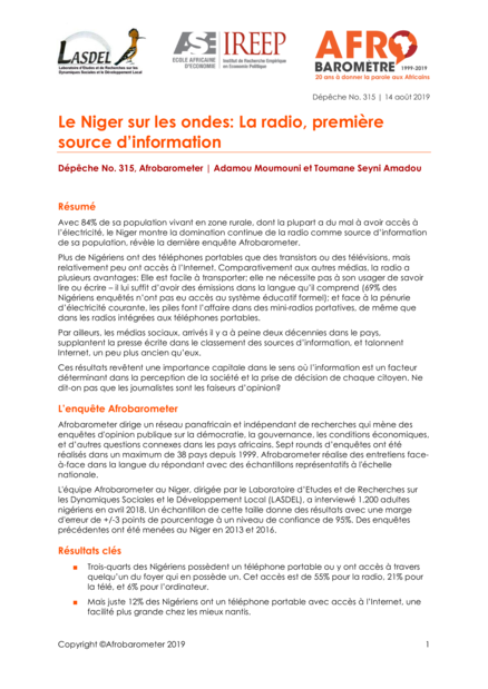 "Trois-quarts des Nigériens possèdent un téléphone portable ou y ont accès à travers quelqu’un du foyer qui en possède un. Cet accès est de 55% pour la radio, 21% pour la télé, et 6% pour l’ordinateur. Mais juste 12% des Nigériens ont un téléphone portable avec accès à l’Internet, une facilité plus grande chez les mieux nantis. La radio est la source d’information la plus utilisée, avec six Nigériens sur 10 qui l’écoutent au moins quelques fois par mois. En termes de régularité, 32% des Nigériens suivent les informations à la radio tous les jours, 13% à la télé, 6% sur Internet, 6% sur les médias sociaux, et 1% seulement via la presse écrite. Radio, télévision, Internet, médias sociaux, et presse écrite ont une constante: Ils sont davantage suivis pour les infos par les urbains que par les ruraux, par les hommes que par les femmes, et par les plus instruits que par les moins instruits." (Résultats clés)
