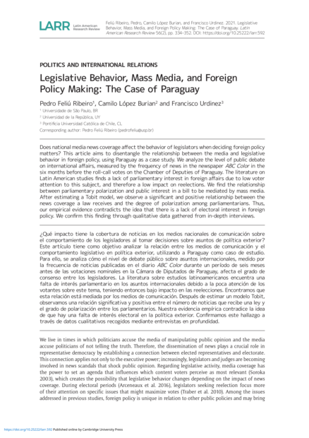 "Does national media news coverage affect the behavior of legislators when deciding foreign policy matters? This article aims to disentangle the relationship between the media and legislative behavior in foreign policy, using Paraguay as a case study. We analyze the level of public debate on international affairs, measured by the frequency of news in the newspaper ABC Color in the six months before the roll-call votes on the Chamber of Deputies of Paraguay. The literature on Latin American studies finds a lack of parliamentary interest in foreign affairs due to low voter attention to this subject, and therefore a low impact on reelections. We find the relationship between parliamentary polarization and public interest in a bill to be mediated by mass media. After estimating a Tobit model, we observe a significant and positive relationship between the news coverage a law receives and the degree of polarization among parliamentarians. Thus, our empirical evidence contradicts the idea that there is a lack of electoral interest in foreign policy. We confirm this finding through qualitative data gathered from in-depth interviews." (Introduction)